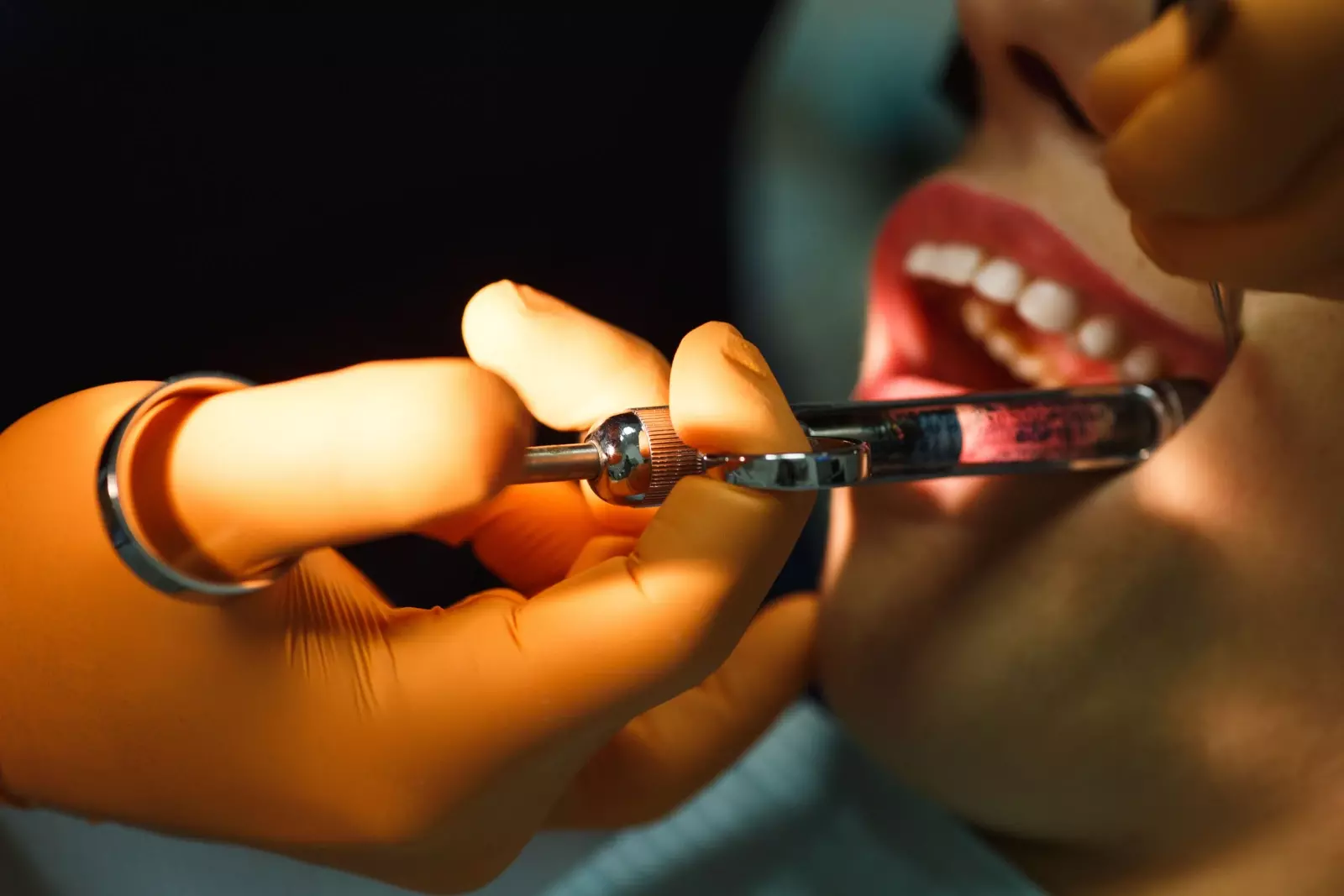 يستخدم طبيب الأسنان ابرة بنج خاصة بالأسنان لحقن محلول المخدر بجوار الأعصاب التي تزود المنطقة التي سيتم تنفيذ الإجراء فيها، ويتم إدخال الإبرة في الأنسجة اللينة لتجويف الفم مثل اللثة.