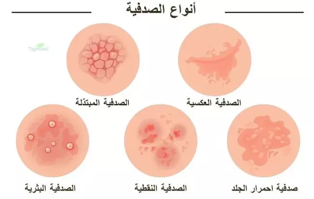 - الصدفية النقطية (Guttate Psoriasis): تظهر عادة بعد عدوى حلقية، وتبدو كبقع صغيرة حمراء منتشرة على الجلد.