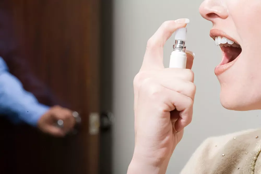 تتوفر أغلب معطرات الفم على شكل بخاخ لسهولة الاستخدام ويتم رشها داخل الفم.