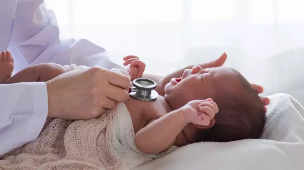 يستمع الطبيب أثناء الفحص إلى رئتي الطفل لملاحظة أي أصوات غير طبيعية مثل صوت الصفير الذي يدل على وجود خطب في التنفس.