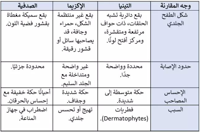 قد تختلط التينيا على كثير من الأشخاص مع أمراض جلدية أخرى، مثل الإكزيما أو الصدفية، لكن هناك علامات مميزة تساعدك على التفرقة بينها، تعرف من خلال الجدول الآتي إلى الفرق بين التينيا وأمراض جلدية مشابهة